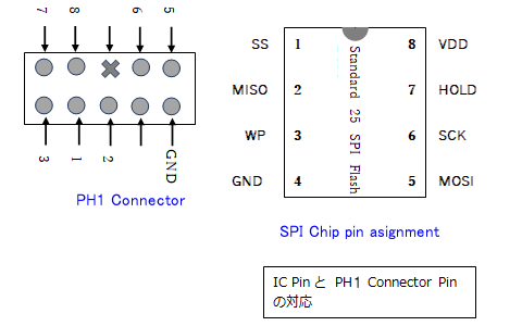 後先になったが、買ってから 件のマザボの PH1 Pinヘッダーと SOP-8 ICの足の導通をテスターでチェックしてみたら図-4の通りになった。(コネクタとSPIチップの向きは上の写真と同じ) この図を参考に CH341A のソケットと マザボの対応コネクタピンを接続する。