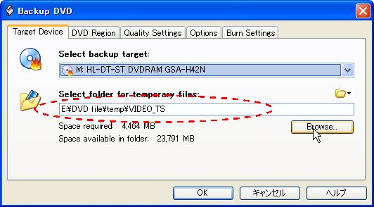 DVD Shrink が生成するファイルフォルダーを<Buckup>ボタンを押した後の下記の画面で確認しておく。