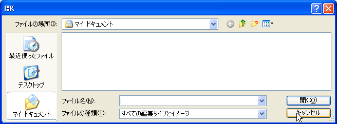 イメージファイルを選択するダイアログが表示されるので、キャンセルボタンを押して消す。