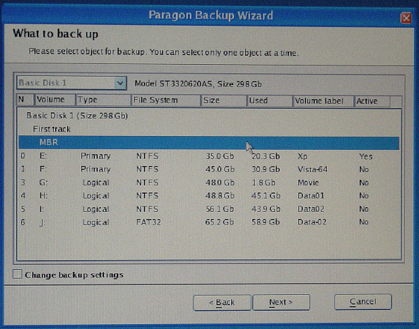 選択したHDDのMBRとパーティション一覧が表示される。通常は、ターゲットのO/Sパーティションだけでいいが、HDDを乗せ換える時や、万が一ウィルスなどで MBRが破壊されたときは MBRもバックアップがあった方が確実。MBRは容量も非常に小さく時間はかからないので少なくとも一回はバックアップしておくといい。(パーティションを変更した時にはバックアップをし直さないといけない)
