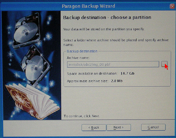 バックアップアーカイブの保存先を選ぶ。右の参照ボタンを押す。