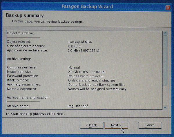 確認して、問題なければここで「Next」ボタンを押すと バックアップが始まる。
