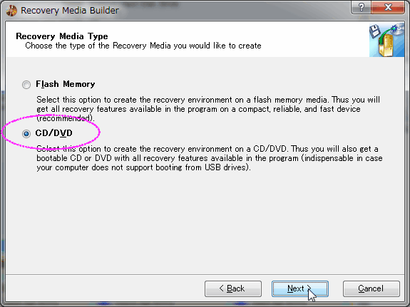 「CD/DVD」をマークして「Next」をクリック