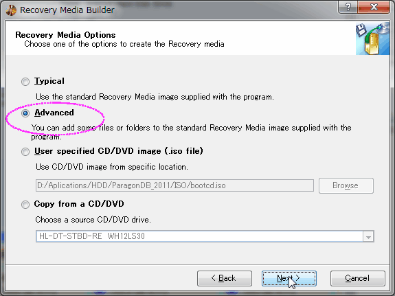ディスクイメージ同梱のリカバリーメディアの場合は「Advanced」をマークして「Next」をクリック