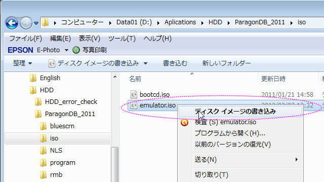 ISOイメージファイルは Paragonのインストールフォルダの \ISO フォルダの中に「Emulator.iso」という名前で作成される。