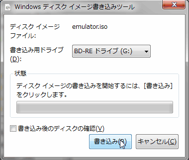 ディスクに書き込む場合は確認画面が表示されるのに Emulatorでは、いきなり ISOファイルの作成が始まる。2回目以降は以前のファイルが残っていると警告なく上書きされるので注意。