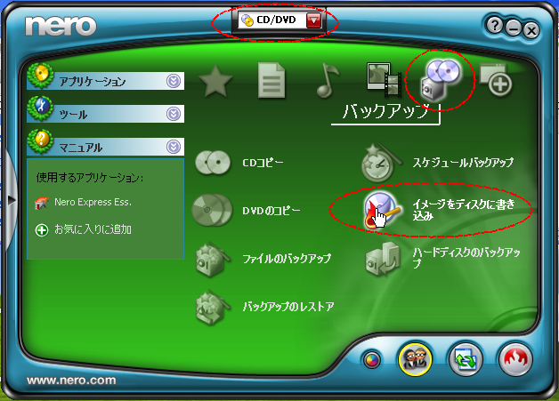 Noro の場合は、一番上のプルダウンで「CD/DVD」を選んだあと、表示されたツールアイコンのうち右から2番目のアイコンをクリックすると、下に「イメージをディスクに書き込み」というボタンが現れるのでそれをクリックする。