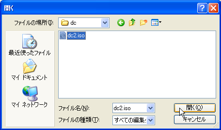 書き込むイメージファイルの指定ウィンドウがポップアップするので、解凍した「dc2.iso」ファイルを指定して「開く」ボタンを押す。