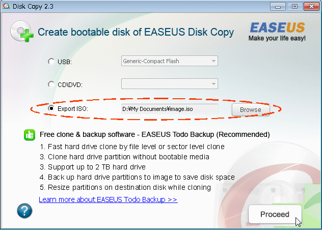直接 CD/DVDドライブに書き込む場合は「CD/DVD」を、一旦 ISOファイルを作成して CD/DVD書込みツールで書き込む場合は「Export ISO」を選択して「Proceed」ボタンを押す。(この起動ディスク作成ツールが CD/DVDドライブを認識しない場合があるようなので、その場合は「Export ISO」を選ぶ)