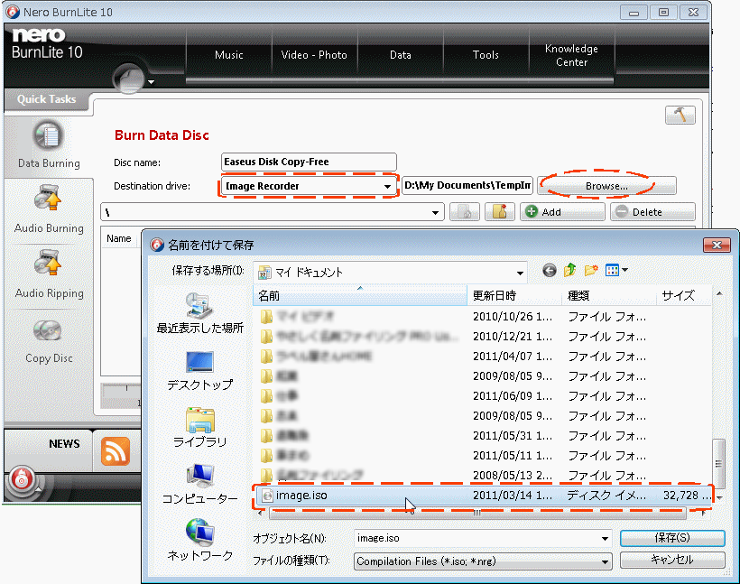 以下の図は、Nero BurnLite を使って書き込む場合の例。「Data Burning」メニューで「Distination drive」に 「Image Recorder」を選択した後で 「Browse」ボタンを押して image.iso ファイルのあるフォルダを開くと *.isoファイルが選択できるようになる。他のアプリでも大概 「イメージファイルの焼き込み」のような機能を使って焼き込める。
