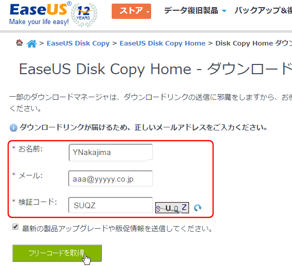 EASEUSのページ(日本語)から Disk Copy をダウンロードする。