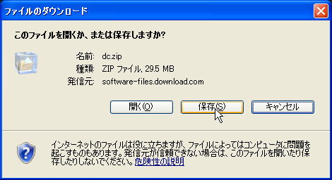 「このファイルを開くか、または保存しますか?」というダイアログが表示されるので、「保存」(「開く」でもいいが)をクリックして、デスクトップなどに名前を付けて保存する。