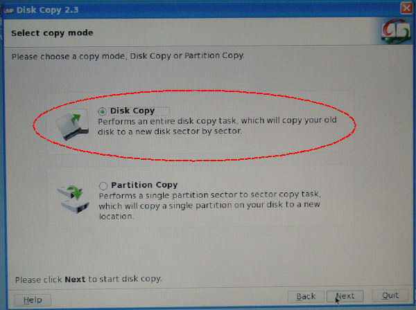 コピーボードの選択。 「Disk Copy」を選択して 「Next」を押す。