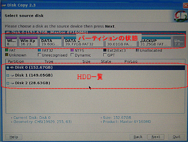 下の欄に接続されたHDDの一覧と、そこで選択したHDDのパーティションの状態がリボン状に上に表示される。通常はここで起動ディスクの「Disk 0」を選ぶ。