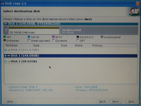 「Select destination disk」(コピー先のディスク)を下の一覧から選択する。通常は 「Disk 1」を選んで「Next」を押す。