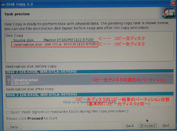 確認のためにここまでに設定した処理の内容が表示される。(以下の図は、説明のために不適切な HDDを接続したので、コピー後のパーティションの表示は正しくない)