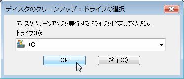 「スタートアップ」 > 「全てのプログラム」 > 「アクセサリ」 > 「システムツール」 > 「ディスククリーンアップ」と辿って、「ディスククリーンアップ」を起動します。