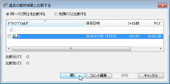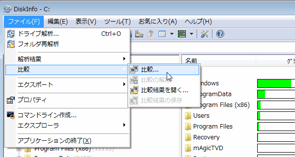 ある期間に、どれくらいの容量の増減があったか、その増減はどのファイル/フォルダが支配的なのかを調べるには、DiskInfoの比較機能を使います。