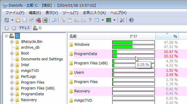 %やサイズなどの文字が赤いフォルダは容量が増えたフォルダ、灰色は減ったフォルダです。