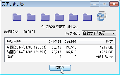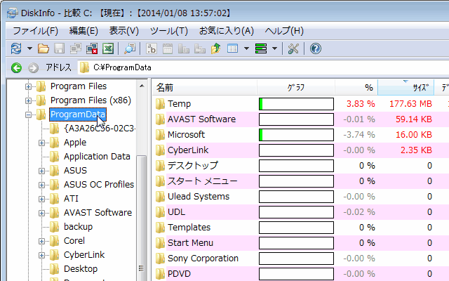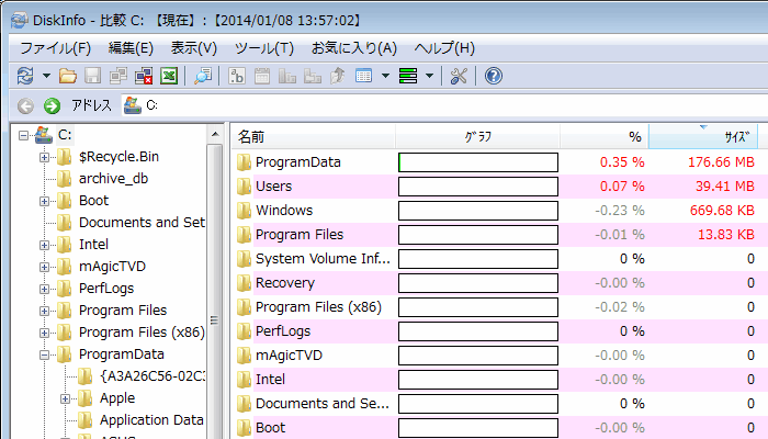 この例では、「ProgramData」フォルダが一番増えて ≒176MB増えたことになります。