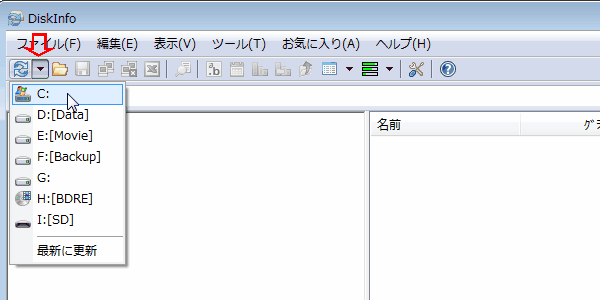 Disk Infoを起動したら、ツールバーの一番左側のボタンの「▼」を押して、 「C:」を選択します。