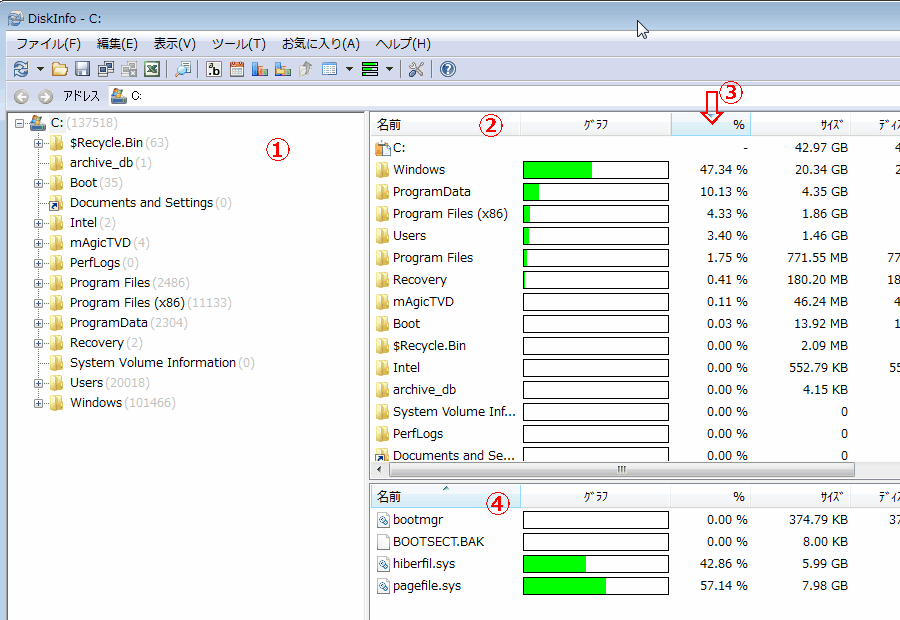 右ペインの「%」の部分(③)をクリックすると、フォルダ容量の 少ない順 >> 多い順に並び変えられます。