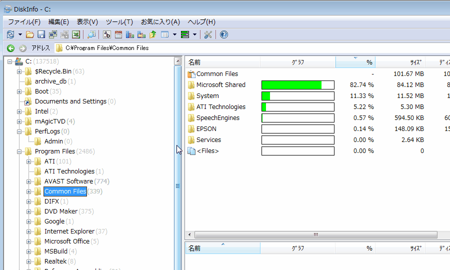 もし、明らかに大きなフォルダがあれば、フォルダツリー上でそのフォルダをクリックすれば、上の図のようにそのフォルダの中のサブフォルダの容量が再び右ペインに表示されます。幾つかのフォルダをこうして辿っていくと、どんなフォルダが異常に大きいのか分かると思います。