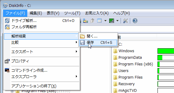 解析が終わった状態で、「ファイル」 > 「解析結果」 > 「保存」を選択します。