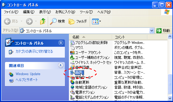【コントロールパネル】 >> 【画面】から【スクリーンセーバー】タブを開きます。