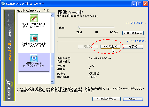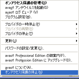 次はHDDの中をいじくり回すので、セキュリティソフトが監視をしたままだと、すぐにチェックに引っかかって面倒ですから、セキュリティソフトの監視を一次休止にします。これはソフトによって操作や画面が若干異なります。以下はかなりマイナーだと思いますが、私が使っている無料の Avast!の例です。 スクリーン右下のタスクバーから、セキュリティソフトのアイコンを「右クリック」します。