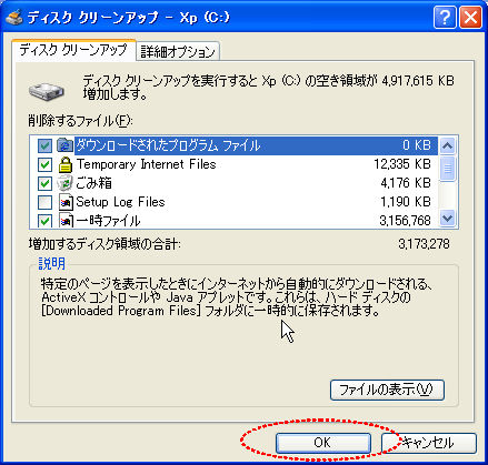 【マイコンピュータ】を開いて、【Cドライブ】の上で右クリックして、【プロパティ】を選択し、【ディスクのクリーンアップ】ボタンを押します。