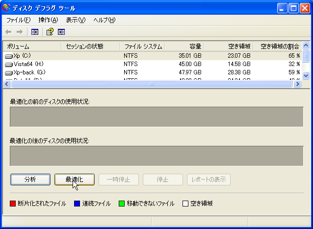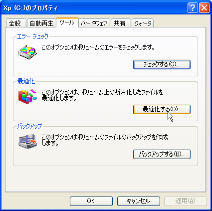 再び【マイコンピュータ】 >> 【Cドライブ】で右クリックして【プロパティ】を表示し【ツール】タブを開き【最適化する】を押します。