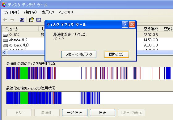 「最適化が完了しました」という表示がされ、デフラグの状態が表示されます。デフラグ前と比べるとかなりすっきりした状態になりました。