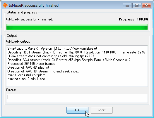④「Start muxing」ボタンを押すとオーサリングが開始される。