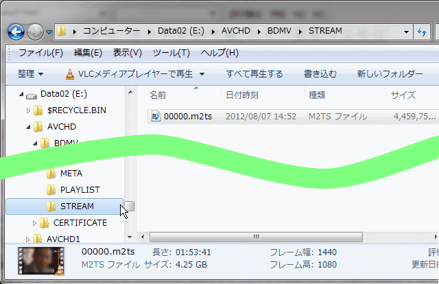 オーサリングが完了すると、指定した保存フォルダの下に「BDMV」「CERTIFICATE」という2つのフォルダが生成され、\BDMV\STREAM というフォルダの中に「0000.m2ts」というファイルが生成される。これが動画ファイルの本体になる。
