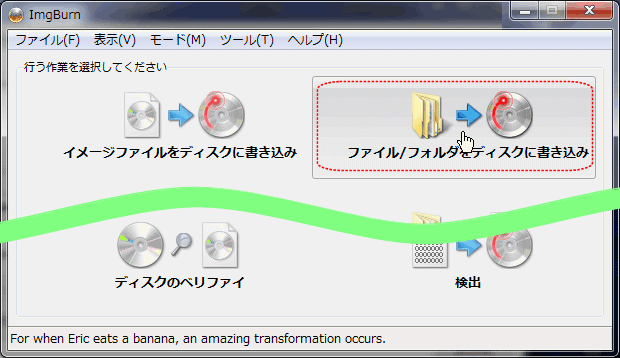 ImgBurnを起動したら、右上の「ファイル/フォルダをディスクに書き込む」ボタンを押す。