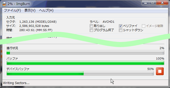 2GB程度の動画ファイルならディスクなどに問題なければ書き込みは 15分程度もあれば終了する。書き込みが終了するとトレーが一旦排出されるが、ベリファイにチェックをしてあった場合は再びトレーが閉じて照合動作が続行する。