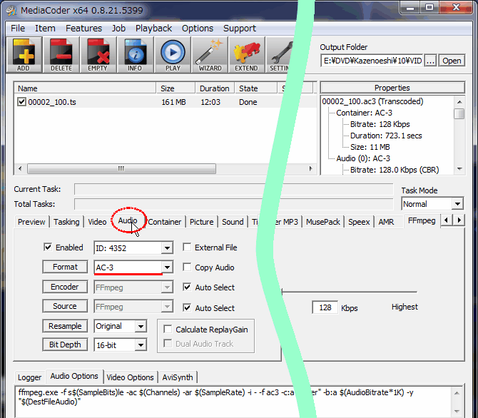 Mediacoderで、この「本編 2」のファイルを読み込み、Audioタブで Formatを 「AC3」に設定し、