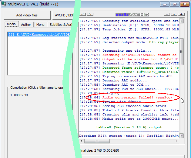 この「本編 2」のファイルは、そのまま multiAVCHDに読み込ませてオーサリングすると以下のように、ログに「Audio conversion failed!」エラーが表示されて、その場合焼いたBDムービーの該当部分からは音声が再生されない。