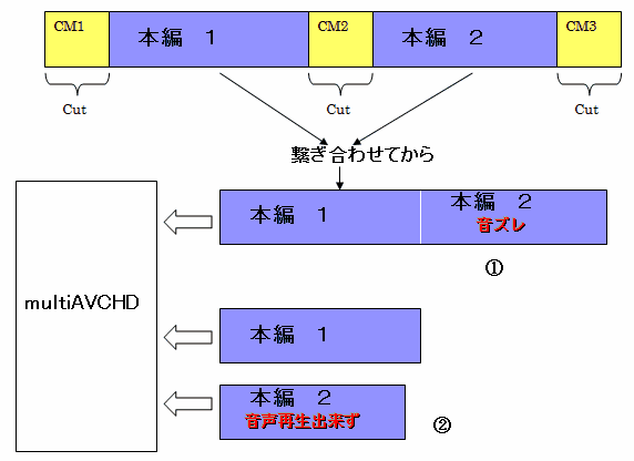 私が実際に遭遇したケースとして、リッピング後のファイルをそのまま BDに焼いた場合は問題なく、間の CM部分だけをカットすると残した途中の本編部分に 1秒近い音ズレが発生し、CM部分だけをカットして残した本編を個別のファイルとして multiAVCHDに食わせると今度はその中のいくつかの本編では音が出ない、という現象が発生した。