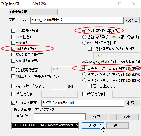 TsSplitterでファイルを分割するには 右図のように「HD画像を残す」「番組情報で分割する」「音声チャンネル切替で分割(SEPA)」のチェックを入れて分割する。