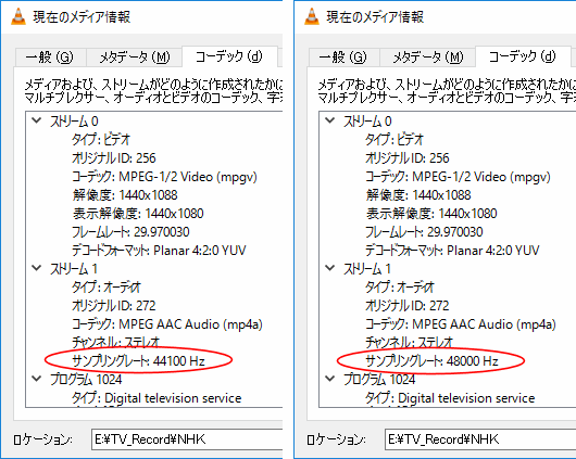 右の図の左側がオーディオトラックを「無効」にする前の VLCメディアプレーヤのコーデック情報、右が「無効」にした後のコーデック情報。ここから、「無効」にする前は VLCメディアプレーヤは音声のサンプリングレートを 「44.1KHz」と認識しており、一旦無効にした後で再指定した後は「48KHz」と認識していることが分かる。