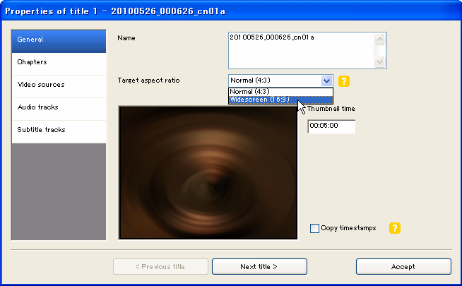 「Edit title..」ボタンを押すと下図のようなタイトル毎の属性設定画面が表示されるので「General」の 「Target aspect ratio」で「Wide screen(16:9)」を選ぶ。