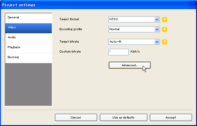 表示された「Project settings」画面の 「Video」タブで 「Advanced」をクリックする。