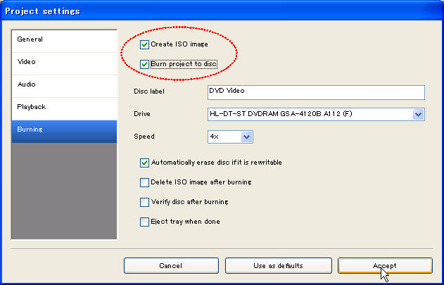 「Burn project to disc」にチェックを入れる。