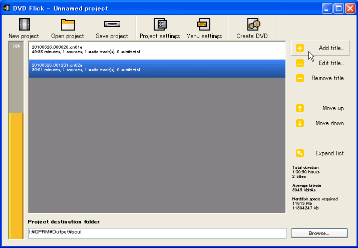 実行すると下図のような画面が立ち上がる。右端の 「Add title..」をクリックして、分割された *.mpg ファイルを全て追加する。追加された MPEGファイルは画面中央に上から順番に登録される。