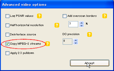 「Advanced video settings」画面で「Copy MPEG-2 streams」を押せば画質劣化につながる再エンコーディングがされることはなく、処理速度も速くなる。(追加した MPEGファイルの総合計が 4.7GB未満の場合)