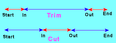 赤い部分が削除され、青い部分が残る部分。Trim 操作では In/Out の外側が削除され、 Cut 操作では In/Out の間が削除される。番組の開始時間や終了時間がずれて余分な部分をカットする場合は Trim、コマーシャルなど番組途中の不要部分の削除は Cut という操作になる。当然 何カ所もカットしたい場合は Cutを繰り返す。