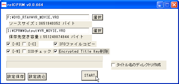 「START」ボタンを押すと、CPRM 解除動作が開始される。コマンドプロンプトからの作業よりはかなりやり易い。