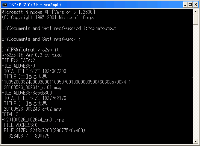 vro2split は圧縮を解凍しておく。CPRM解除した *.VROファイルと *.IFOファイルの存在するフォルダに実行ファイルだけをコピーして、コマンドラインから実行する。